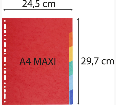 Napravljen od recikliranog kartona živih boja od 220 g/m2. Pregrade su A4 maksi veličine i višestruko izbušene da bi se uklopile u većinu registratora i fascikli. S obzirom da su razdelnici širi, to znači da se mogu videti kada se arhiviraju sa dokumentima kao što se mogu videti kartice. Pregrada ima 6 sekcija i jezičaka koji se mogu označiti.