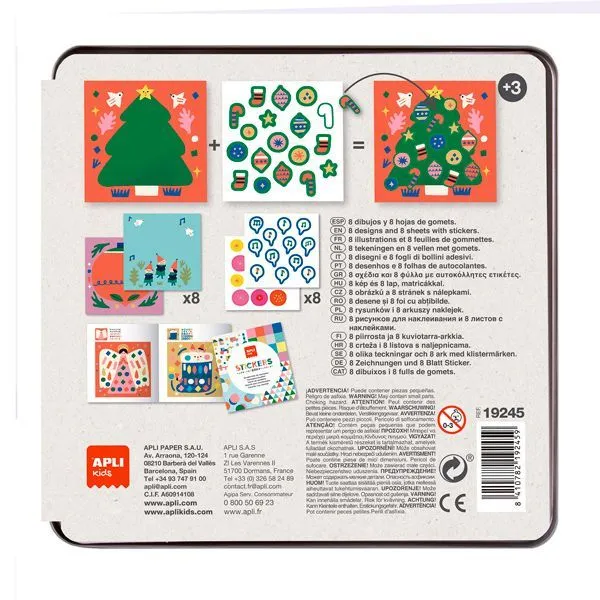 Set nalepnica na božićnu temu. Cilj igre je da dovršite crteže na karticama koristeći različite geometrijske nalepnice. Komplet sadrži: 8 listova za popunjavanje nalepnicama, 8 listova uklonjivih nalepnica u različitim bojama i vodič sa primerima boja. Uklonjive nalepnice u igri omogućavaju detetu da ispravi ako napravi grešku. Ova igra, razvijena uz podršku vaspitača, ima visoku edukativnu vrednost: stimuliše finu motoriku, razvija matematičko mišljenje, pomaže u koncentraciji, radi na razvoju ruku i očiju i promoviše prostornu orijentaciju.