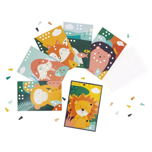 Ceo svet boja! Uz ove prelepe slike i drvene mozaike, deca od 3 godine razvijaće finu motoriku i spretnost dok uče boje! Savremene kartice nežnih boja gde deca mogu da stave drvene delove na pravo mesto i ožive slatke životinje na kartama! Lisica, jež, majmun... Svi oni čekaju da budu ukrašeni! Ova igra je idealna za miran provod sa decom. Delovi su dizajnirani za male ruke (1,5 cm u prečniku), za lako držanje! Pametno: kutija služi kao postolje za karte, sve što treba da uradite je da ih stavite i ukrasite. Kreativna i zabavna aktivnost, gde će deca naučiti imena životinja, boja i takođe različite nijanse! Nema potrebe za lepkom, to je aktivnost u kojoj će deca uživati iznova i iznova. Ova igra sadrži: 7 kartonskih bušenih karata i 70 drvenih komada.